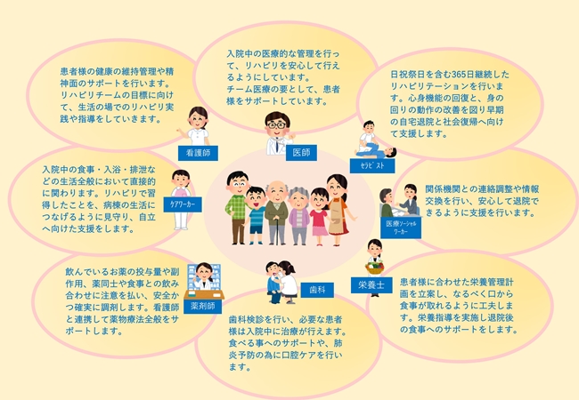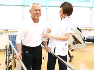 対象となる特定疾患の患者様に対し、日曜日、祝祭日を含む365日リハビリテーションを実施しております。回復期各病棟には専用の訓練室を設け、集中的にリハビリテーションを行っております。また一般病棟よりもカンファレンスなどのチーム連携が充実しており、患者様の退院先の地域のケアマネージャー、民生員、福祉機器業者などの協力も得ながら、在宅や社会復帰の援助を積極的に進めています。